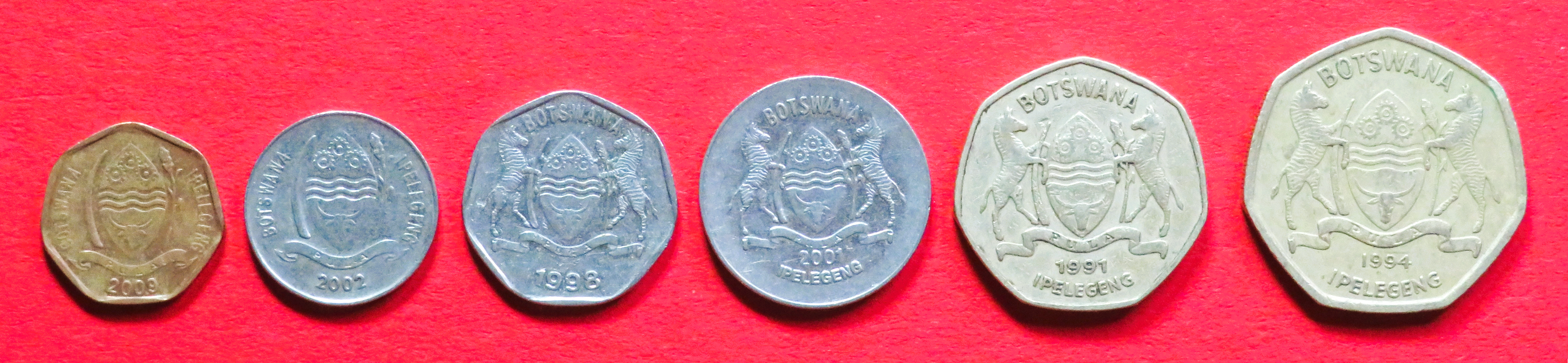 Botswana - Set 1: 5/10/25/50 Thebe + 1/2 Pula, 1998-2009, gebrauchte Erhaltung (used / ss+)