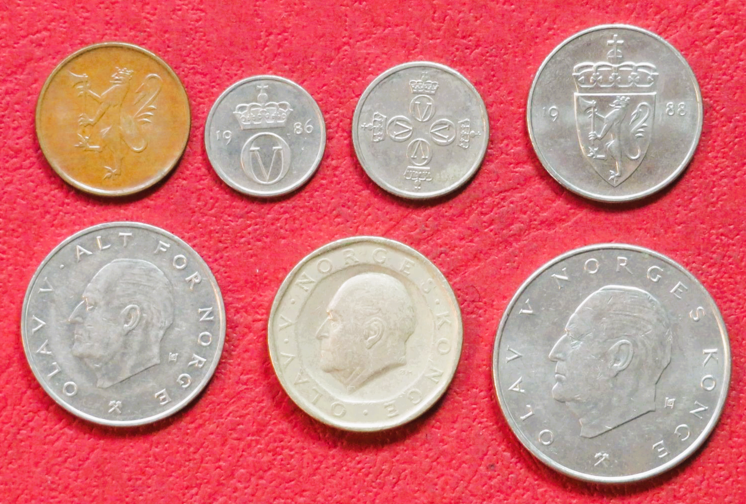 Norway - Set 5: set of 7 coins, 0,05-10 Kroner, 1973-1991, circulated condition (USED / vf)